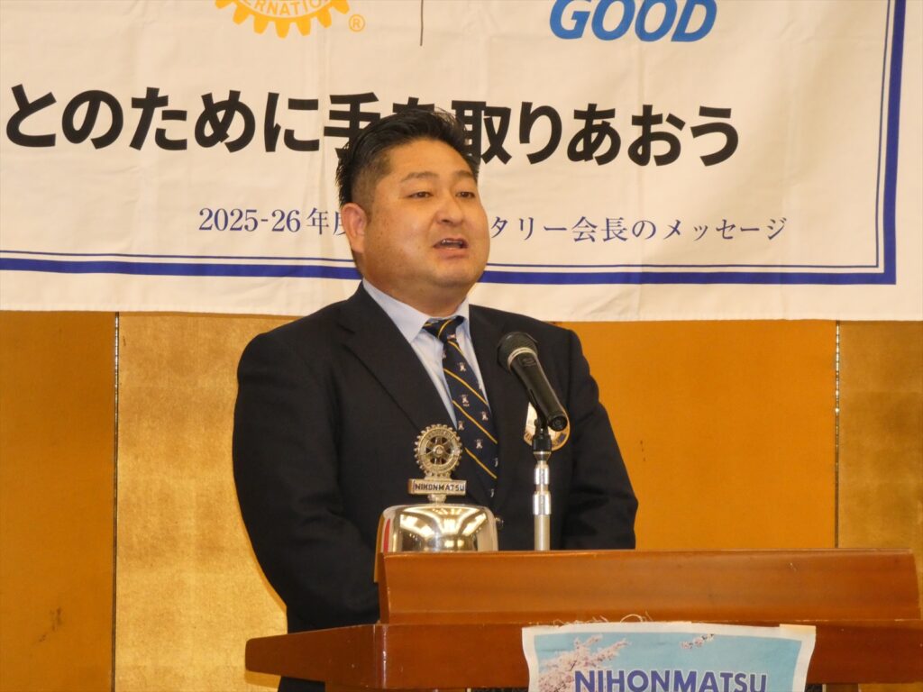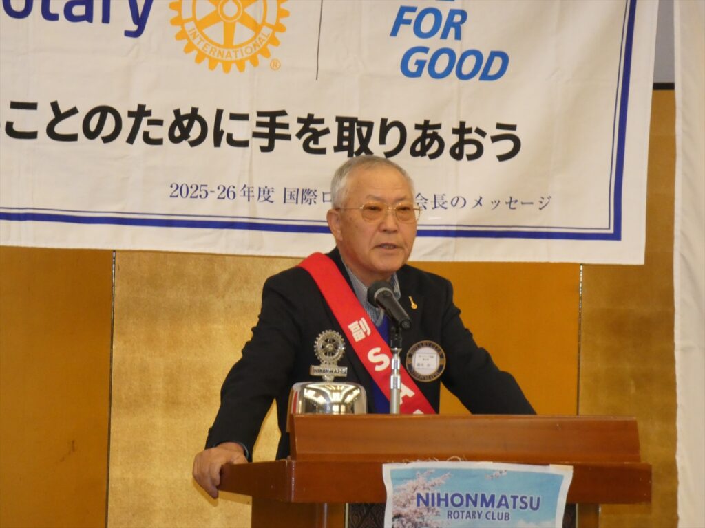 第3041回(井上航会長年度第15回)夜間例会は12月3日、アーバンホテル二本松で開かれました。「奉仕の理想」を斉唱し、ロータリーの目的を唱和しました。井上会長があいさつし、メンタルヘルスや健康の取り組みの重要性を指摘しました。結婚、誕生祝いの会員を祝福して乾杯しました。菅野京一会計が2025-2026 年度財務状況中間報告をしました。前田智美クラブ管理運営委員長が大坪八重子会員がJR二本松駅前のプランターにパンジーを植えたことや、菊の植栽にも取り組みたいこと、米山記念奨学生の李雨潼さんが学友会で水ギョーザを作って振る舞ったこと、多国籍の楽しい雰囲気などを紹介しました。